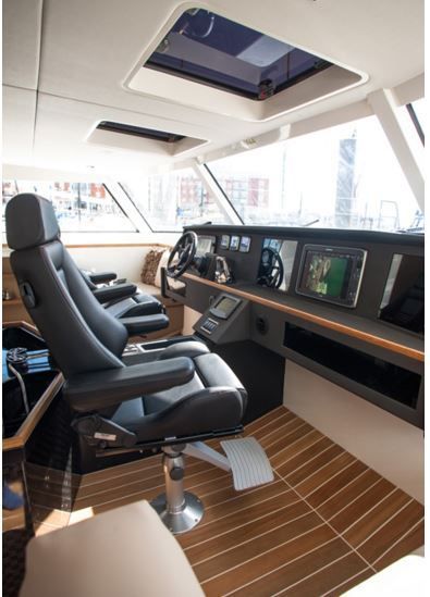 Car le Rapier centralise l'ensemble de ses opérations depuis l'avant du carré, qui rassemble les winchs et pianos, en pied de mât !! Des opérations facilitées par de larges baies virées de toit, qui permettent de vérifier à tout moment la situation de la grand voile tout en inondant le carré de lumière.