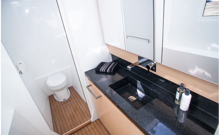 Catamaran de propriétaire, le Rapier 550 propose une version 3 cabines offrant une suite propriétaire dans la coque babord, et deux belles cabines invités à tribord. dont l'aménagement opte pour un design moderne et discret, bien dans l'air du temps.