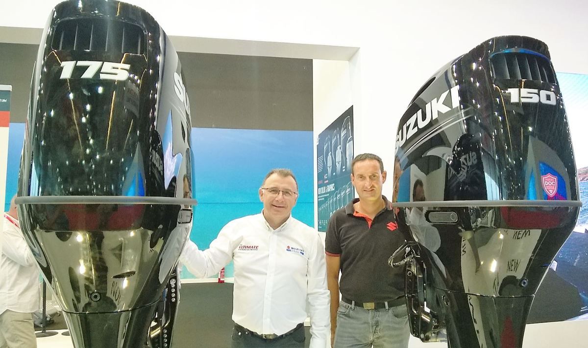 Christophe Vassas et Laurent Lépicier, de Suzuki Marine France, lors du Genoa Boat Show, devant les 2 nouveaux moteurs hors-bord DF175AP et DF150AP