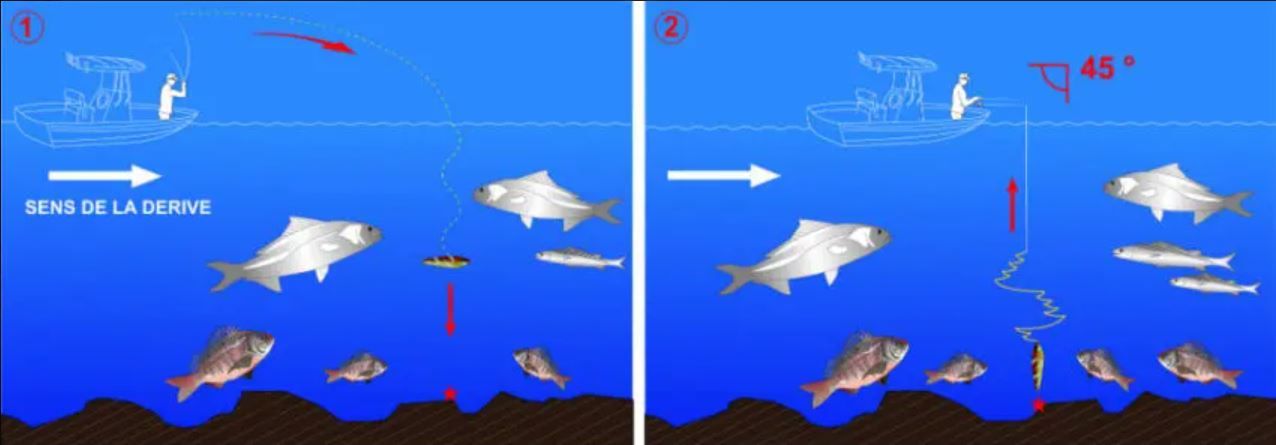 Dans cette pêche, on le fait descendre verticalement pour l’animer à la remontée ou, mis en mouvement, il adoptera une trajectoire diagonale, dans le sens du courant.
