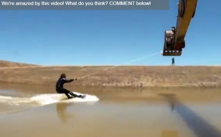 A défaut de bateau et de vaste plan d'eau, le wakeboard peut tout à fait sur un plan d'au fermé, circulaire pourquoi pas, surtout quand la véhicule tracteur est un... Caterpillar !